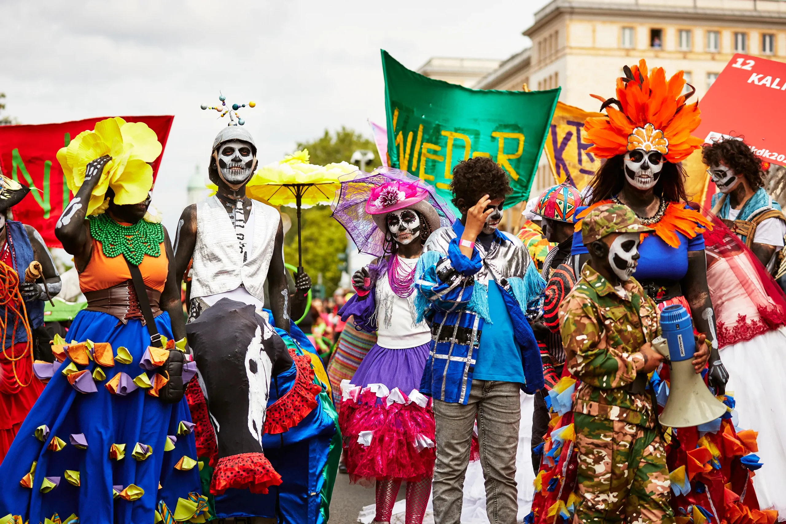 Seit 30 Jahren ist Calaca fester Bestandteil des Karnevals der Kulturen in Berlin. Drei Jahrzehnte künstlerischer Präsenz, politischer Haltung und kollektiven Engagements. Inmitten von Kriegen, Rassismus, Ausgrenzung und sozialen Ungleichheiten erhebt Calaca seine Stimme in einer karnevalesken Ästhetik, in der Kunst zu Widerstand, Erinnerung und Hoffnung wird. Unsere Sprache ist Körper, Farbe, Musik und Bewegung. Wir glauben an eine gerechte, vielfältige und solidarische Welt – und tanzen weiter. Heute, morgen und in den nächsten 30 Jahren.